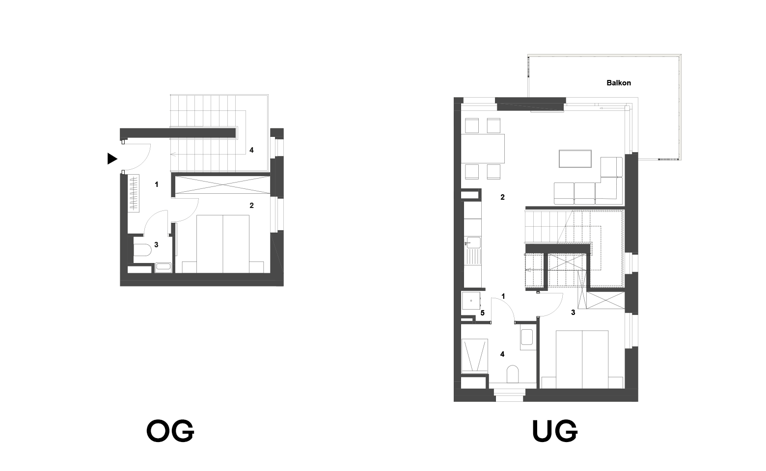 Die beiden Ebenen sind harmonisch miteinander verbunden und ermöglichen eine klare Trennung zwischen Wohnen und Schlafen, was der Wohnung ein besonderes Raumgefühl verleiht.