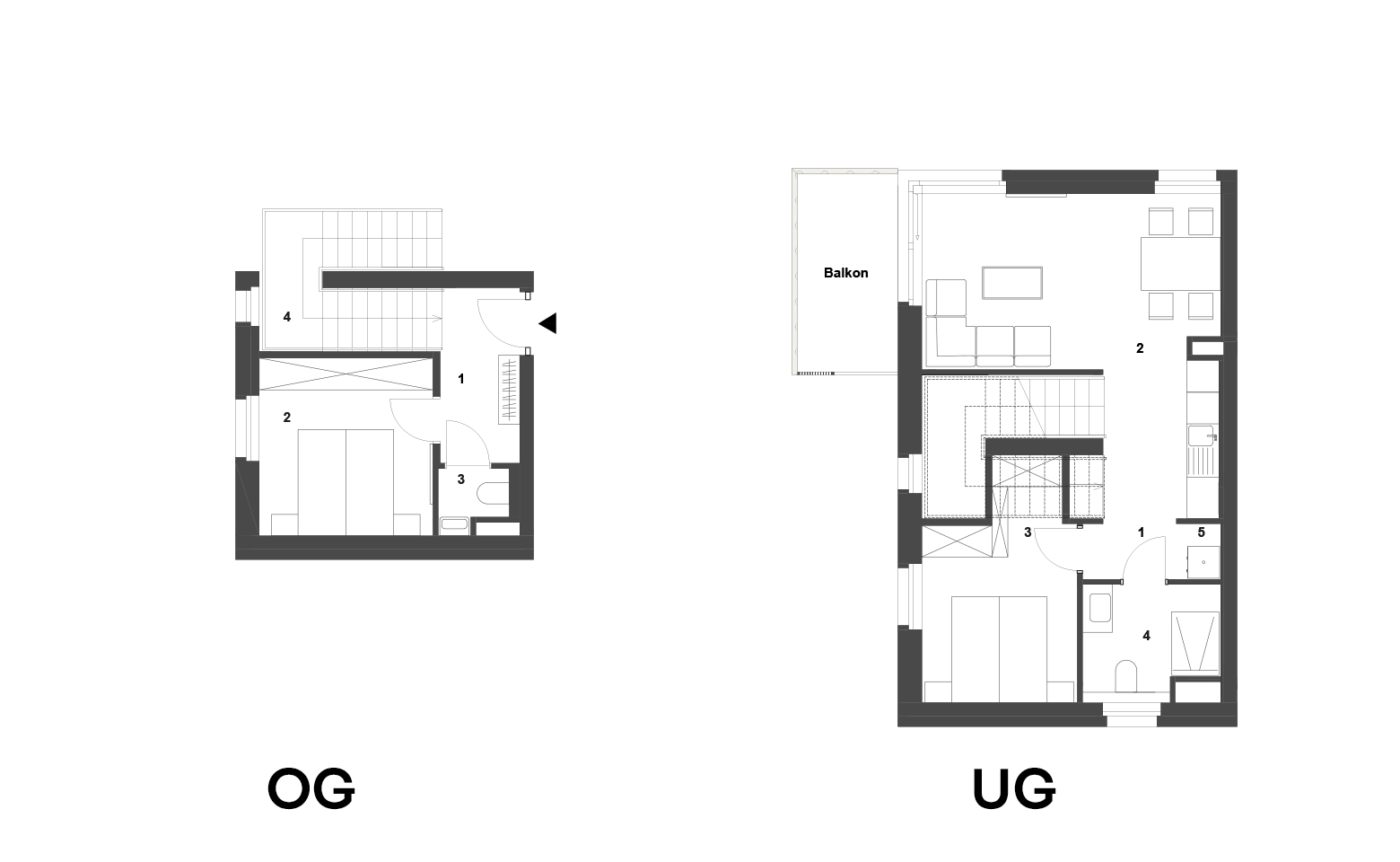Die beiden Ebenen sind harmonisch miteinander verbunden und ermöglichen eine klare Trennung zwischen Wohnen und Schlafen, was der Wohnung ein besonderes Raumgefühl verleiht.