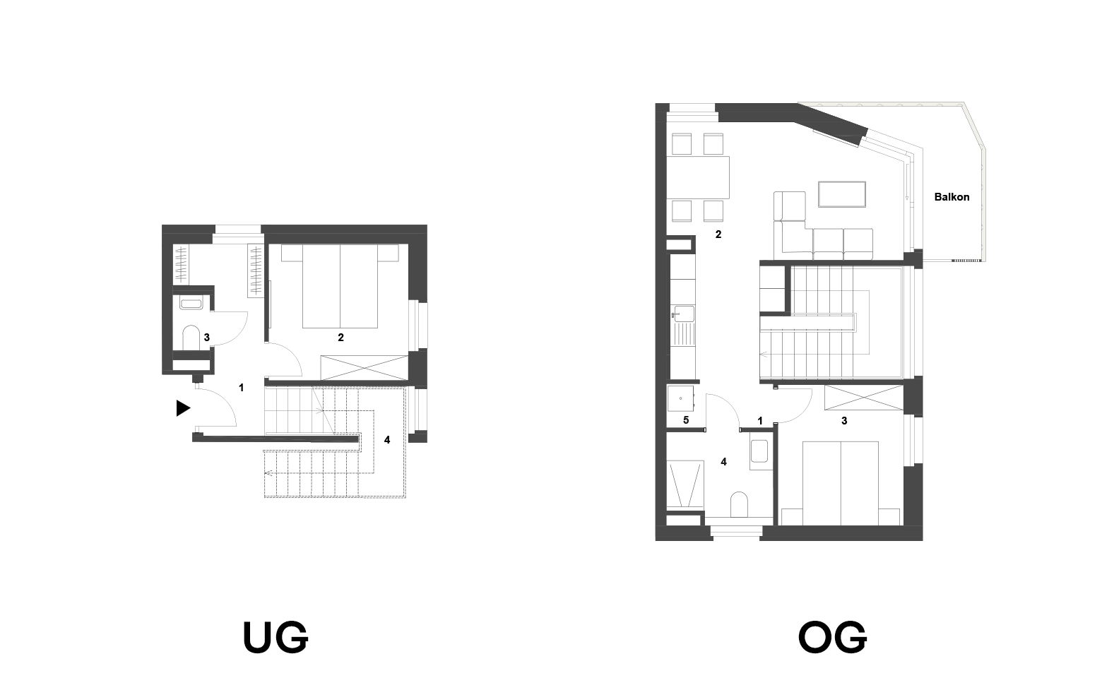 Die beiden Ebenen sind harmonisch miteinander verbunden und ermöglichen eine klare Trennung zwischen Wohnen und Schlafen, was der Wohnung ein besonderes Raumgefühl verleiht.