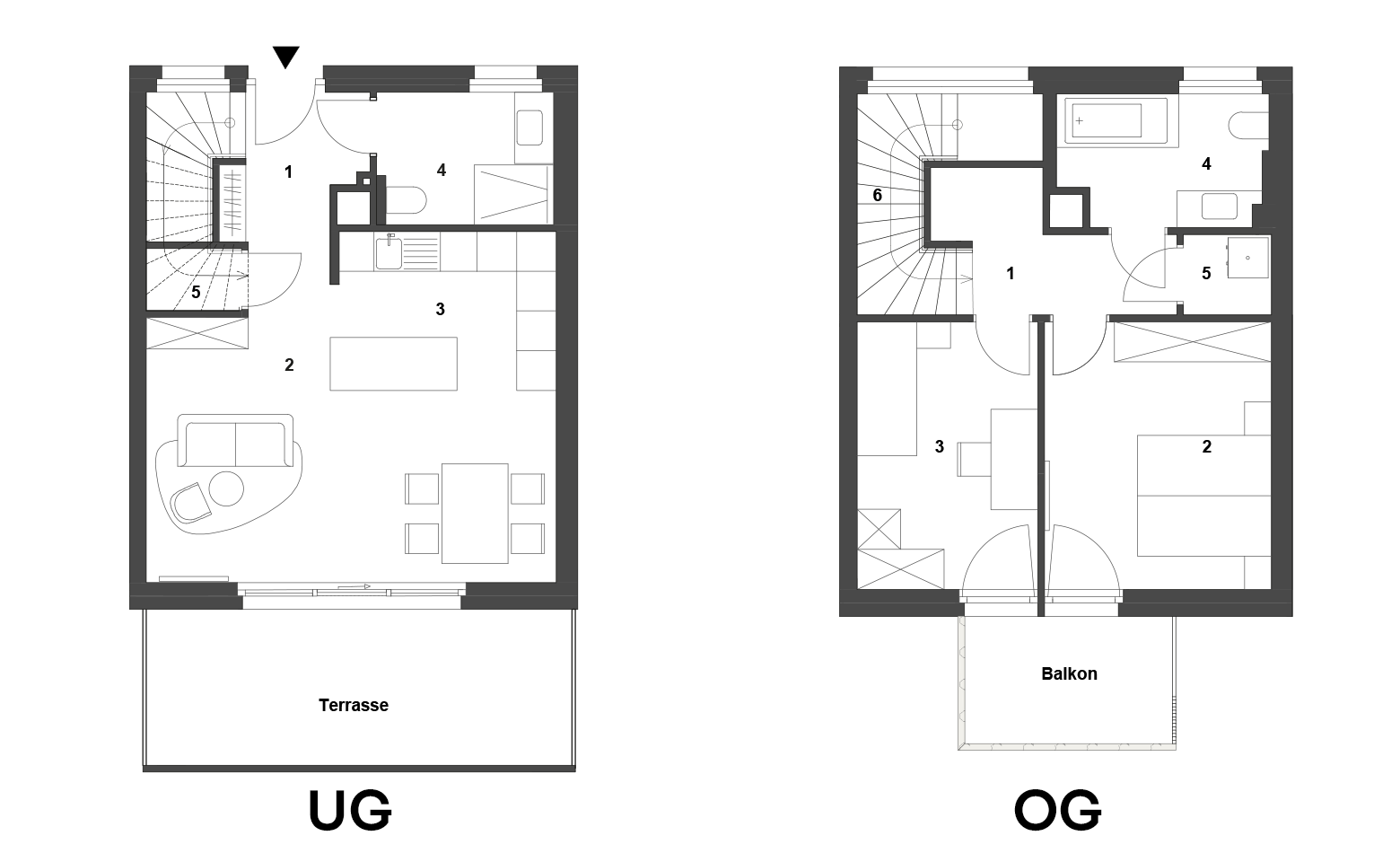 Der untere Bereich begeistert mit einem weiten, hellen Wohnraum, der durch große Fensterflächen in Sonnenlicht getaucht wird und fließend auf die weitläufige Terrasse übergeht. Sie ist wie ein zweites Wohnzimmer im Freien – ideal für entspannte Stunden oder gesellige Abende unter freiem Himmel.