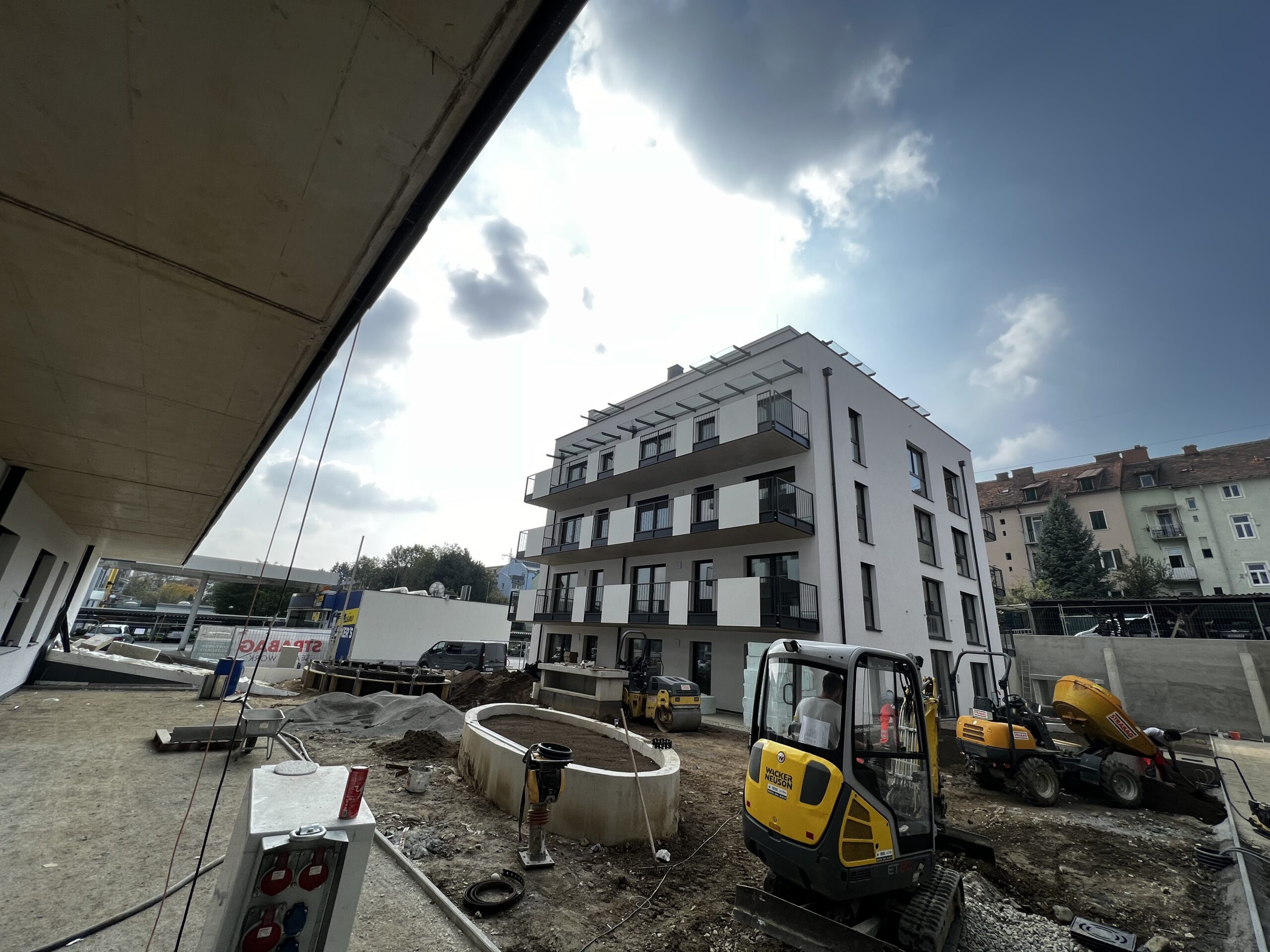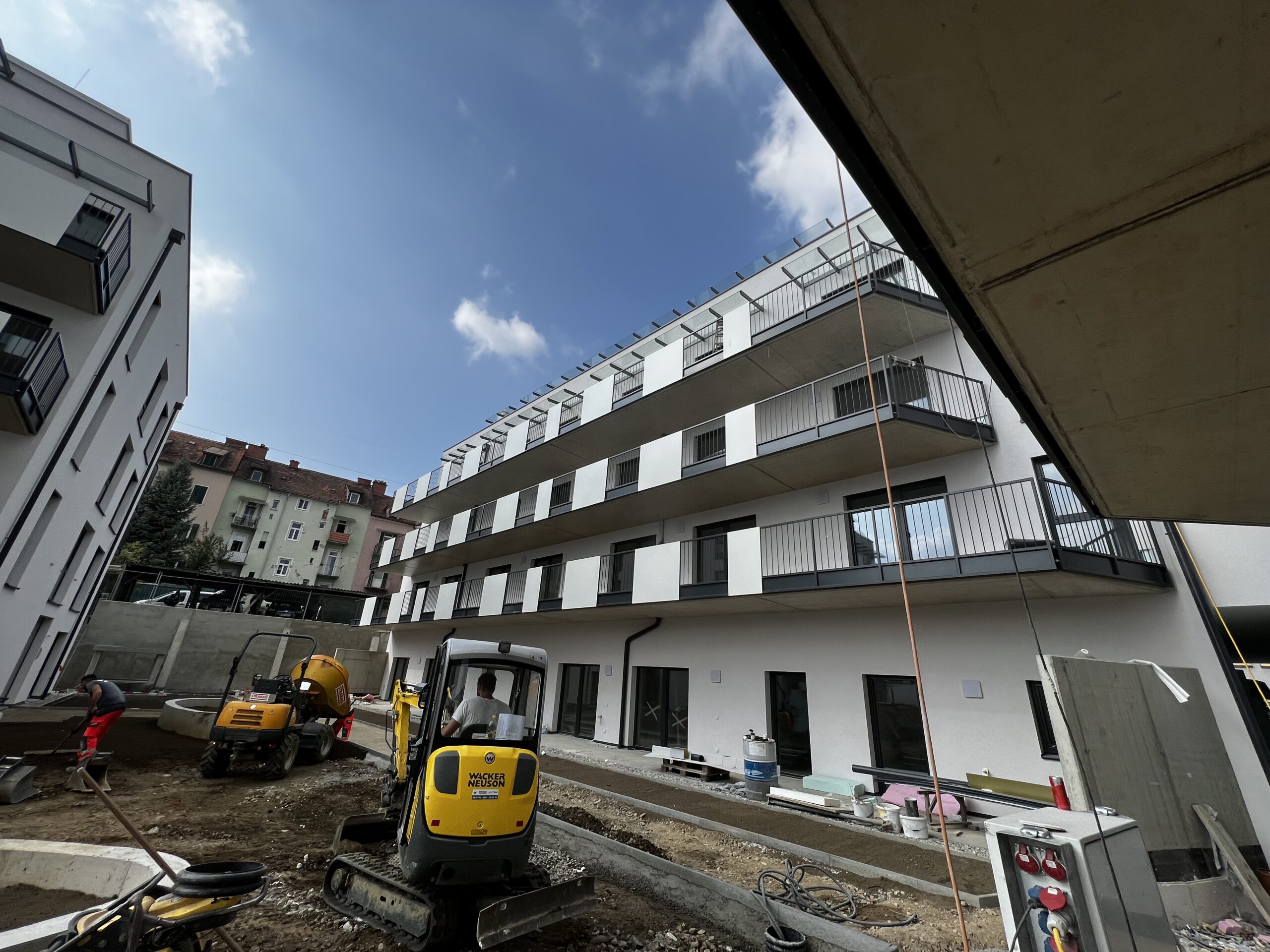 Der Ausbau schreitet gut voran und die Fassadenflächen wurden bereits fertiggestellt. Im Innenhof wird mit Hochdruck an den Außenanlagen gearbeitet während im Inneren des Gebäude bereits mit den Verlegearbeiten für Boden und Fliesen begonnen wurde.